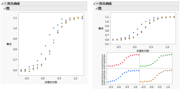 “拟合曲线”报表:无分组变量(左)和有分组变量(右)
