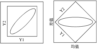显示两个响应的正相关如何成为差值(垂直轴)上的小方差。若为负相关,则椭圆将在另一个方向上延伸,并且旋转图形的方差在垂直轴上较大。