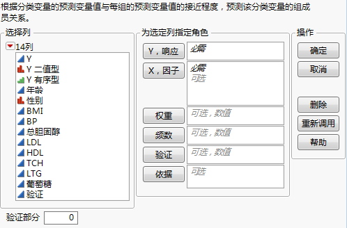 选择验证列。详细信息,请参见验证方法。 若在“选择列”列表中没有选择任何列的情况下点击“验证”按钮,您可以向数据表添加一个验证列。有关“生成验证列”实用工具的详细信息,请参见《预测和专业建模》手册中的““生成验证列”实用工具”。