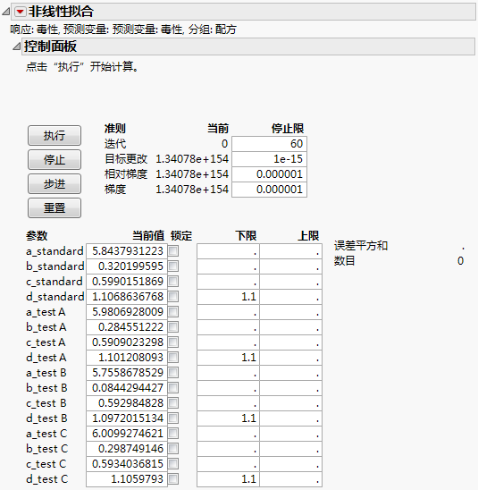 随即显示“非线性拟合”窗口(图 13.17)。在控制面板中,显示参数值和锁定选项。列在每个参数之前的字母对应于“拟合曲线”函数中预测模型的变量。