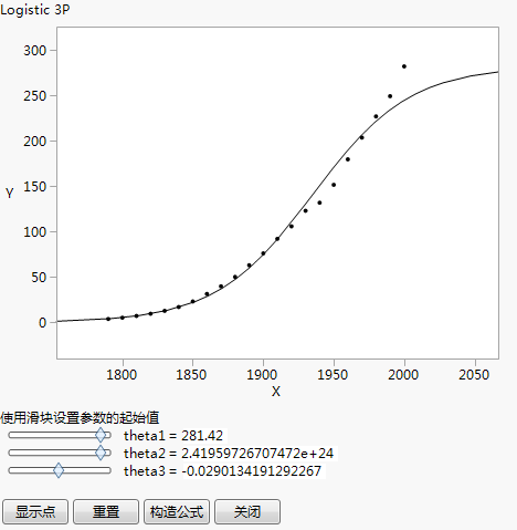 点击显示图形可以针对单参数模型显示二维理论曲线,针对双参数模型显示三维曲面图。对于包含两个以上解释变量 (X) 的模型,不提供图形。在图形窗口上,可以使用滑块更改参数的默认初始值,或是直接点击并输入值。请参见图 13.8。