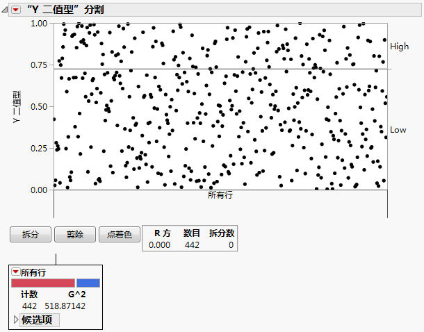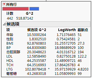 最优拆分通过一个星号来标注。不过在某些情况下,“候选项 G2”最大值与“Logworth”最大值对应的不是同一个变量。在这种情况下,使用 > 和 < 为每个变量指出最佳方向。星号对应于两者一致的状况。详细信息,请参见“分割”平台的统计详细信息。