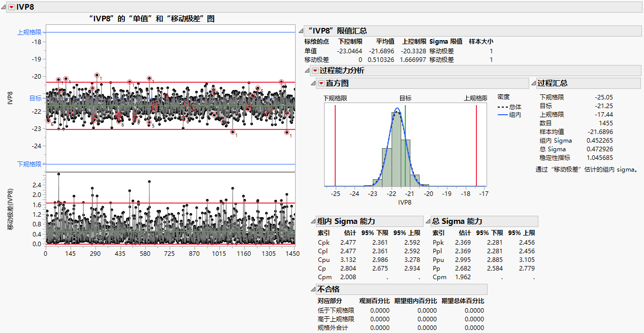 将显示“控制图生成器”报表。因为 IVP8 有“规格限”列属性,该报表还包含能力分析。