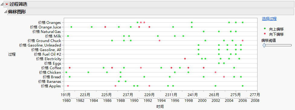 下例说明如何使用“分组”列以及如何使用 Consumer Prices.jmp 构造“偏移图形”。