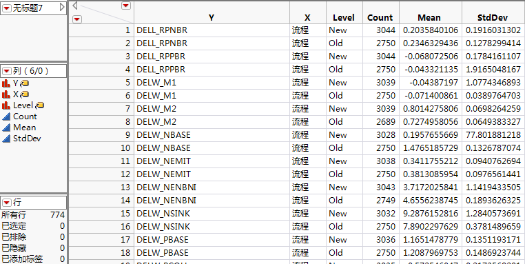 样本数据表,有 387 个响应变量,每个变量针对“流程”的两个水平进行检验。“Means”表包含 387x2 = 774 行(