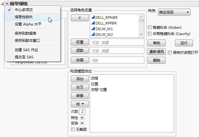 )。尽管存在缺失值,“信息性缺失”编码允许预测模型的估计。这在缺失数据可提供信息的情形中很有用。从“模型规格”红色小三角菜单中选择该选项。