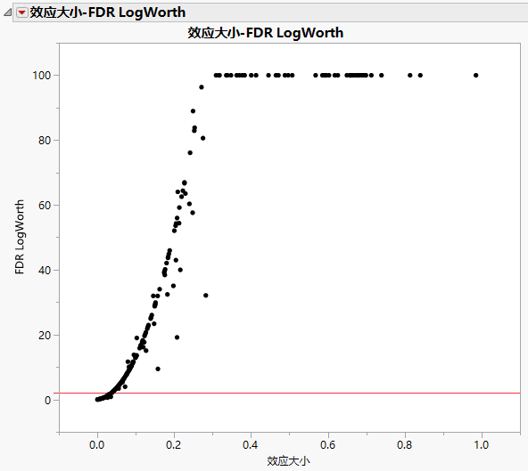 在“效应大小-FDR LogWorth”图中,垂直轴为“FDR LogWorth”,水平轴为“效应大小”。通常情况下,效应越大导致 p 值越显著,LogWorth 值越大。但是,该关系不一定总是成立,因为显著性也依赖于误差方差。实际上,由于误差方差的大小不同,大的 LogWorth 可能与小效应关联,小的 LogWorth 可能与大效应关联。使用“效应大小-FDR LogWorth”图可以探索该关系。