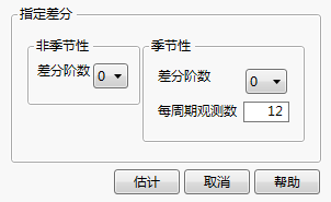 使用“指定差分”窗口可以指定“非季节性差分阶数”d、“季节性差分阶数”D 和“每周期观测数”s。差分阶数为 0 则相当于没有进行相应的差分运算。每次指定差分运算并点击估计时,将在报表窗口中显示新差分报表。详细信息,请参见“时间序列”平台的其他示例。