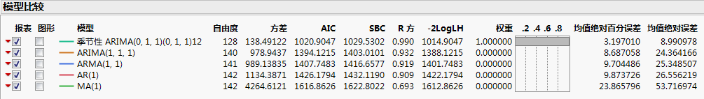 拟合模型后,在报表窗口中显示“模型比较”报表。该报表包含“模型比较”表和模型图。每次拟合新模型时,将一个新行添加到“模型比较”表,并用唯一的颜色编码。“模型比较”表汇总每个模型的拟合统计量,用于比较针对同一时间序列拟合的几个模型。默认情况下,这些模型按 AIC 统计量的降序排序。要按不同统计量对模型排序,请右击“模型比较表”中的任意列并选择“按列排序”。有关拟合统计量的定义,请参见“模型汇总”表。对“模型比较表”唯一的一个拟合统计量是“权重”。该拟合统计量是标准化的 AIC 权重。按以下方式计算模型的 AIC 权重: