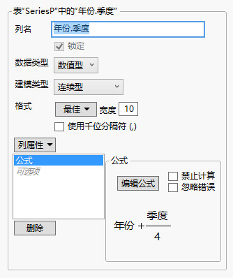 SeriesP.jmp 数据表包含一个年份列和季度列来标识在观测响应期间的时间期间。但是,“时间序列”平台需要具有唯一、等间距的时间点的一列来标记 X 轴。若未指定“时间 ID”,则使用行号标识时间期间。为避免该问题和使报表更易于解释,您从年份和季度构造一个“时间 ID”列。