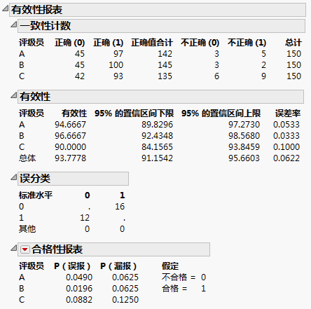 仅当您在启动窗口中指定了“标准”变量后,才会显示“有效性报表”。有关“标准”变量的说明,请参见启动“变异性/计数量具图”平台。该报表将每个评级员与标准进行比较。