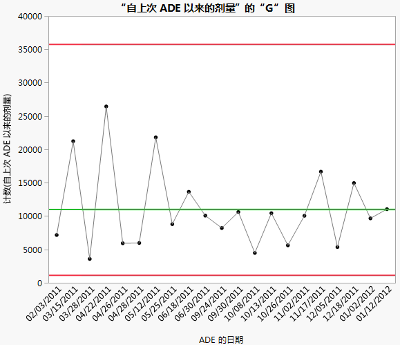 若您清楚您的数据并不服从正态分布(例如,在测量计数或等待时间时),此时稀有事件图会十分有用。若要了解稀有事件出现的频率是否比期望要高,因此值得干预,g 图是一种有效的方式。g 图对自上次事件以来的可能机会进行计数。若使用标准 Shewhart 控制图标绘此类数据,您可能会看到过多的错误信号,因为限值可能过小。Adverse Reactions.jmp 样本数据表包含有关一组医院患者报告的药物不良事件 (ADE) 的模拟数据。ADE 是指患者服用药物后出现的任何类型的伤害或反应。反应日期和自上次反应以来的天数将被记录。