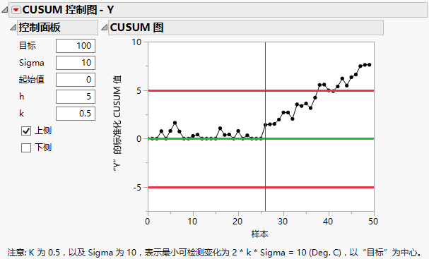 默认情况下,“CUSUM 控制图”平台生成一个报表,其中包含参数控制面板和 CUSUM 图。