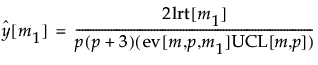 将控制图统计量定义为似然比检验统计量对数的两倍除以 p(p + 3)、除以其近似期望值以及控制限的近似值。因为除以上控制限的近似值,因此可以针对上控制限 1 标绘控制图统计量。按以下方式给出近似控制图统计量: