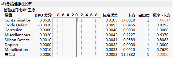 本例使用 Failures.jmp 样本数据表,其中包含失败数据和一个频数列。表中列出集成电路制作过程中失败的原因,以及两个过程中出现每种类型缺陷的次数。为该示例指定的常数样本大小为 1000。