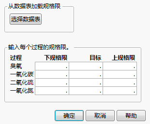 样本数据表的“规格限”窗口。输入已知的规格限,然后点击确定查看“过程能力”报表。