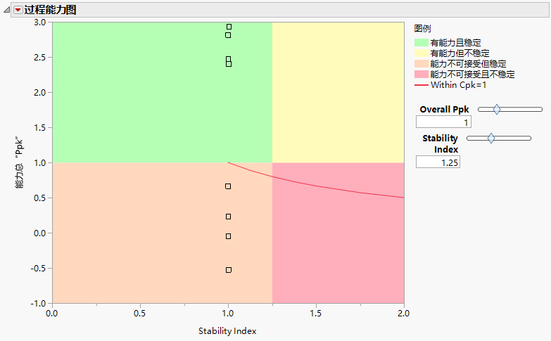 可以使用图下方的 “Ppk”和“稳定性比”滑块控件调节定义四个象限的边界。您还可以在“文件”>“首选项”>“平台”>“过程能力图”中设置所需的“能力和稳定性”边界的首选项。