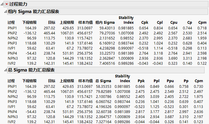 “汇总报表”选项显示或隐藏包含每个变量以下统计量的表:下规格限、目标、上规格限、样本均值、各种 Sigma 估计值、稳定性比、Cpk、Cpl、Cpu、Cp、Cpm 和不合格统计量。使用在报表标题中指定的 sigma 估计值计算这些统计量。图 11.19显示了两个汇总报表的部分列,如示例:包含正态变量的“过程能力”平台中所述。该报表提供以下可选列: