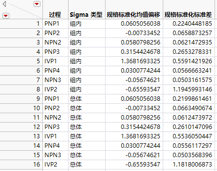 “制作目标图汇总表”选项可生成一个汇总数据表,其中包含每个变量的名称、其规格标准化均值偏移,以及其规格标准化标准差。对于每个变量,每种 sigma 类型都对应一行。