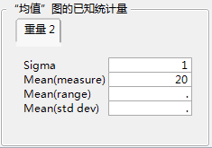 指定某个过程变量后,若点击控制图启动窗口上的指定统计量(若可用)按钮,窗口底部将追加一个选项卡,其中包含可编辑的字段。该选项卡支持您输入过程变量的历史统计量(即,来自历史数据的统计量)。“控制图”平台使用这些条目来构造控制图。下例显示 1 作为过程变量的标准差,20 作为测量值均值。