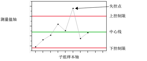 两条红线分别为上控制限和下控制限,相应地标记为“上控制限”和“下控制限”。当过程处于统计控制状态时,这些限值可给出汇总统计量期望的变异范围。若过程仅显示出常规变异,则所有点都会随机散布在该范围内。在图 4.8中,有一个测量值位于上控制限上方。这表明该测量值可能受到特殊原因影响,或者可能是一个缺陷。