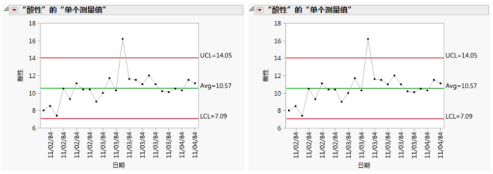 例如,Pickles.jmp 数据表列出了三天每天进行抽样的测量值。在图 4.9中,默认情况下,x 轴上的标签每隔一个刻度就显示一次。有时这会让标签重复出现,如图 4.9中的左图所示。若指定标签使用 8 作为增量,x 轴会每天标注一次,如右图所示。