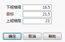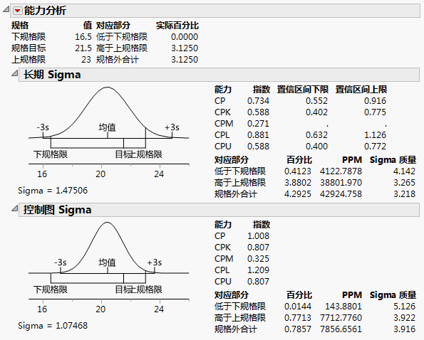Coating.jmp 的“能力分析”报表示例显示在图 4.12中,其中的下规格限设置为 16.5、目标设置为 21.5,上规格限设置为 23。