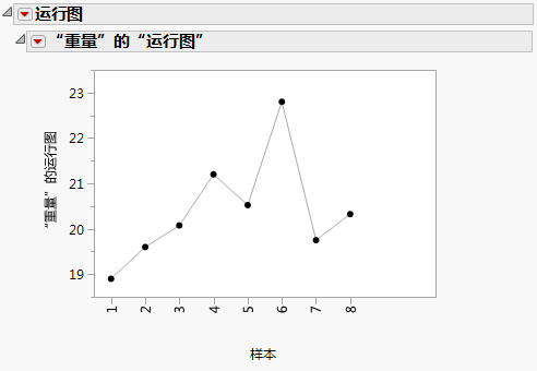 运行图将一列数据显示为一系列连接起来的点。下例显示 Quality Control 样本数据文件夹的 Coating.jmp 中的重量变量的运行图(数据取自 ASTM Manual on Presentation of Data and Control Chart Analysis)。
