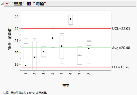 右击重量的均值图,然后选择图表选项 > 箱线图。