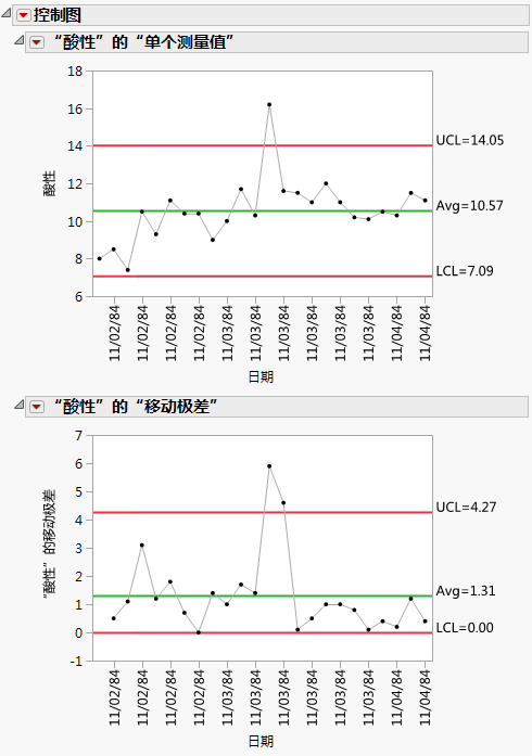 图 4.20中显示的单个测量值和移动极差图监控生产的每一缸泡菜的酸度。