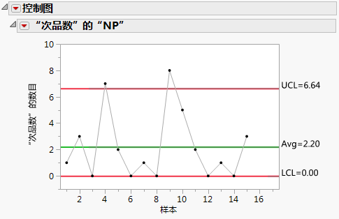显示缺陷数的 np 图随即显示。点 4 和 9 位于上控制限上方。