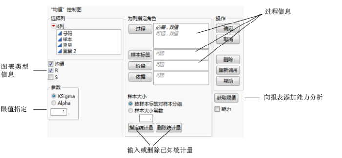 的控制图启动窗口。实际控件随您选择的图表类型而变化。初始窗口显示以下几类信息: