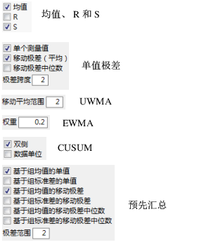 单值极差菜单选项为单个测量值图、移动极差图和移动极差中位数图提供复选框选项。