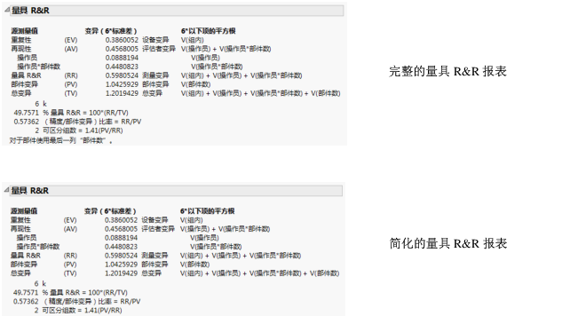 若您在“输入/验证量具 R&R 规格”窗口中提供了容差区间,则在“量具 R&R”报表中会显示容差百分比列。该列的计算公式为:100*(变异/容差)。此外在报表底部会显示(精度/容差)比率。该比率表示由于量具变异性丧失的容差或能力区间所占的比例。