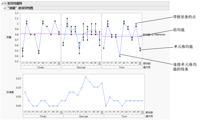 中,测量值图显示按部件划分的每名操作员的测量值极差。每个测量值显示在图上。最大值条和最小值条指示每个单元格值的极差,单元格均值条指示每个值组合的中位数值。标准差图绘制操作员测量每个部件所得测量值的标准差。