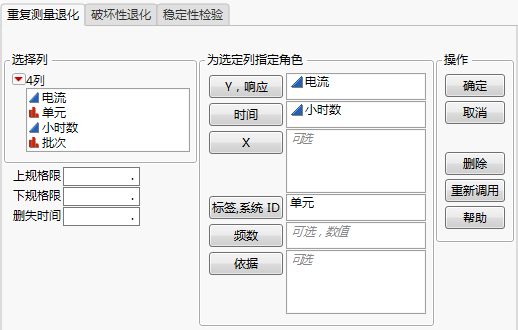 (仅适用于“重复测量退化”选项卡和“破坏性退化”选项卡。)分配说明变量。使用该角色可指定加速退化模型中的加速因子。