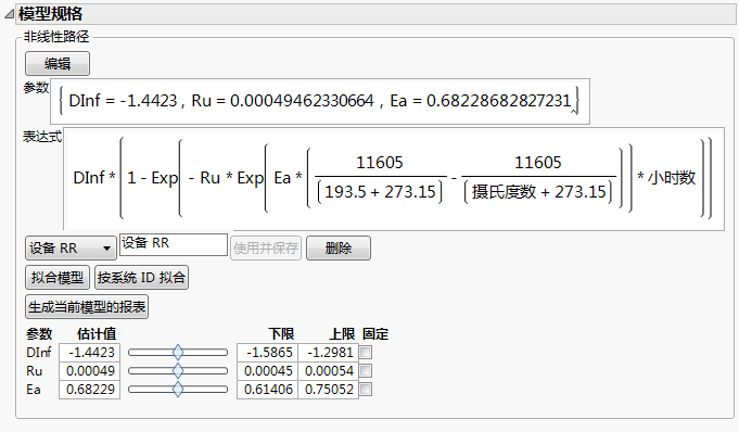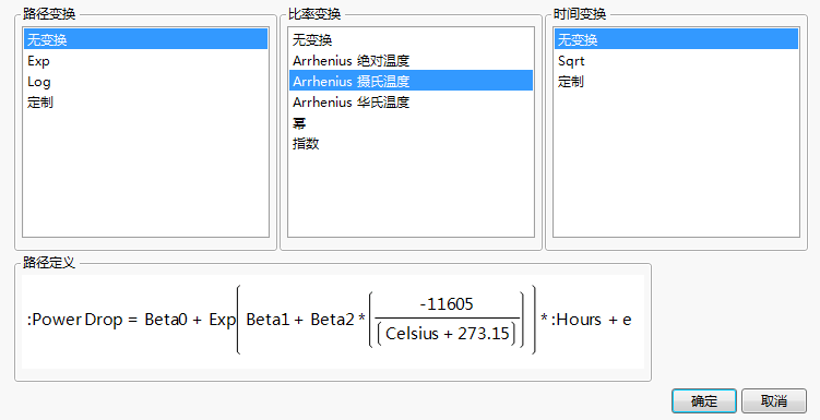 一旦在数据表中创建公式,即从“退化数据分析”红色小三角菜单中选择重新运行 > 重新运行分析。然后,返回列选择所示的列选择。 选择包含该模型的列,然后点击确定。您将返回“非线性路径模型规格”。有关该规格的所有功能的详细信息,请参考“模型规格”详细信息。