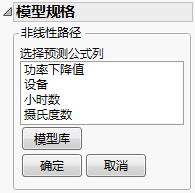 若您想要使用的模型在数据表中不存在,您可以点击模型库按钮使用内置模型之一。有关使用“模型库”按钮的详细信息,请参考模型库或《预测和专业建模》手册中的“非线性回归”。创建模型后,从“退化数据分析”红色小三角菜单中选择重新运行 > 重新运行分析。然后,返回图 7.11所示的列选择。 选择包含该模型的列,然后点击确定。您将返回“非线性路径模型规格”。有关该规格的所有功能的详细信息,请参考“模型规格”详细信息。