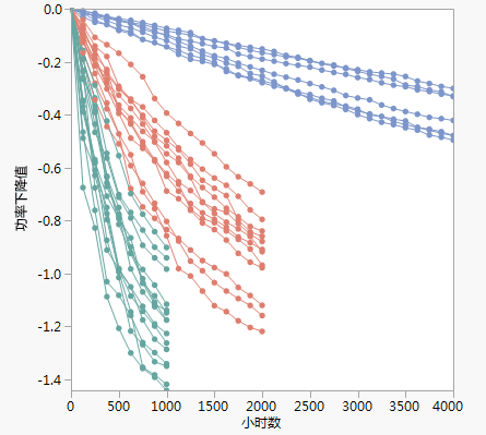 为便于解释“非线性路径模型规格”,请打开 Device B.jmp 数据表。该数据包含在四个温度水平上测量的 34 个单元的功率下降测量值。按以下步骤操作:
