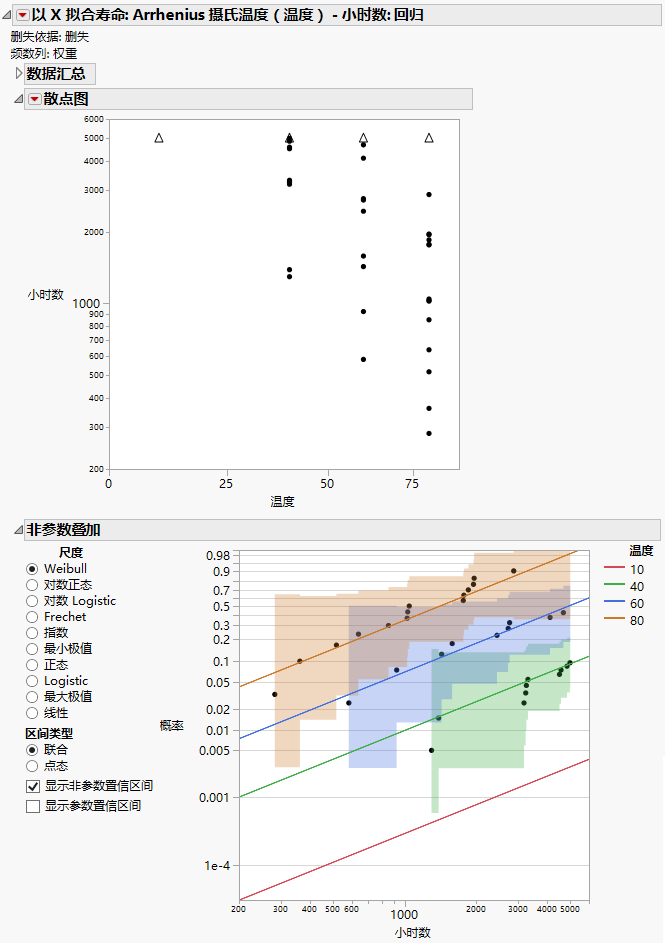 本例使用 Meeker and Escobar (1998) 中的 Devalt.jmp 样本数据表,该数据表位于样本数据的 Reliability 文件夹中。其中包含某设备在加速工作温度下的失效时间数据。在正常工作温度 10 摄氏度时未记录任何失效时间观测;其他所有观测显示为 40、60 和 80 摄氏度这三个加速温度水平下的失效时间或删失值。