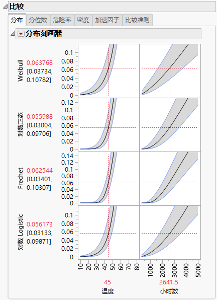 可比较的结果显示在分位数、危险率和密度选项卡上。分布、分位数、危险率、密度和加速因子这些刻画器的行为类似于其他平台中的“预测刻画器”。例如,可拖动温度和小时数的垂线来查看每个分布值如何随着温度和时间变化。有关“预测刻画器”的详细解释,请参见《刻画器指南》手册中的“刻画器”。