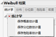 对于每个参数分布,都有一个“统计学”部分显示参数估计值、协方差矩阵、置信区间、汇总统计量和诊断图。您可以通过从每个参数分布的“统计学”红色小三角菜单中选择以上任意或全部选项,从而保存概率、分位数和危险率估计值。估计值以及相应的置信上限和下限会另存为数据表中的列。图 4.14显示了可用于任何参数分布的保存选项。