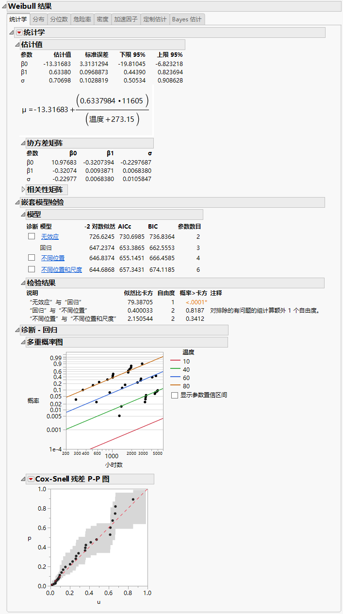 “Cox-Snell 残差 P-P 图”用于验证数据的分布假设。若数据点大幅度地偏离对角线,则分布假设可能不成立。“Cox-Snell 残差 P-P 图”红色小三角菜单包含名为保存残差的选项,该选项支持您将残差数据保存到数据表中。有关 Cox-Snell 残差的讨论,请参见 Meeker and Escobar (1998, sec. 17.6.1)。
