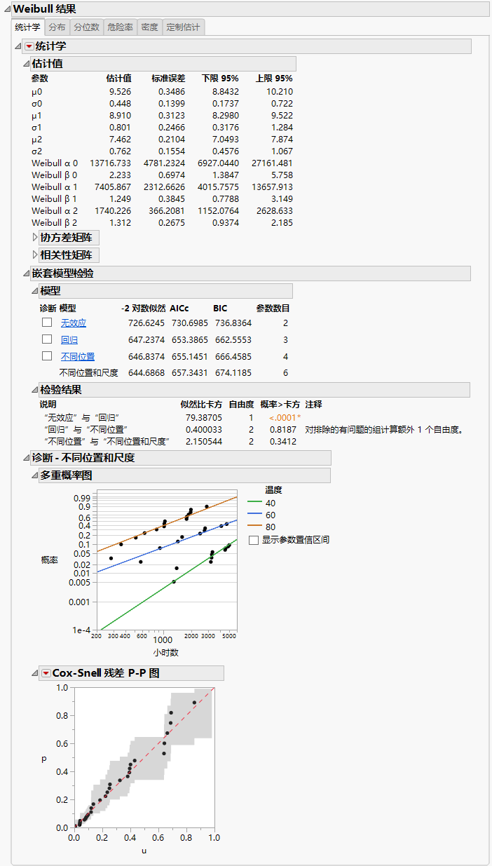 注意:为 Weibull 分布拟合“不同位置和尺度”或“不同位置”模型时,Weibull 分布的这两个参数化都会显示在“估计值”表中,这与图 4.15和图 4.16中的情况相同。有关 Weibull 参数化的详细信息,请参见“生存分析”一章中第 308 页的“Weibull”。