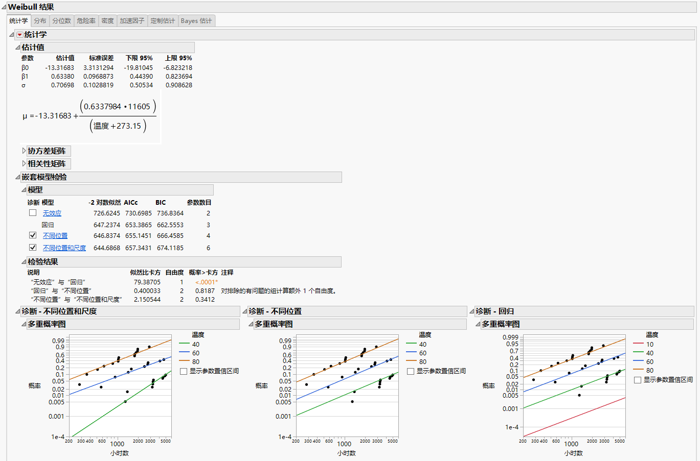 图 4.13中显示的“多重概率图”用来验证加速变量不同水平的分布假设。若每个水平对应的线条未能穿过该水平的数据点,则分布假设可能不成立。并排的比较诊断图可用于直观地比较不同模型的有效性。有关多重概率图的讨论,请参见 Meeker and Escobar (1998, sec. 19.2.2)。每个多重概率图在图例下方都有一个选项,该选项支持您显示或隐藏图中每条线的着色参数置信区间。