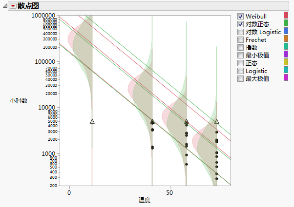 “以 X 拟合寿命”平台帮助您分析仅有一个因子情况下的寿命事件。您可以选择使用各种变换对事件与因子之间的关系建模,或是创建自定义数据变换。您还可以灵活地比较同一因子水平下的不同分布,以及在不同因子水平之间比较同一分布。