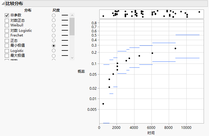 在初始“比较分布”报表中,概率轴和时间轴是线性的。但假定您想要查看基于 Fréchet 尺度的分布估计值。1