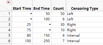 若指定两个变量,这两个变量将被解释为区间删失观测。第一个 Y 变量提供下限,第二个 Y 变量提供每个单元的上限。有关使用两个响应列表示不同类型删失的示例,请参见图 3.5。有关使用两个响应列的删失的详细信息,请参见两个事件时间列。