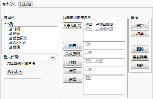 失效原因列中的删失指示符标识在失效原因列中使用的用来指示观测未失效的值。要指定这样的指示符,请选择该选项,然后在出现的框中输入指示符。您还可以从框右侧的列表中选择值。