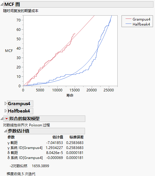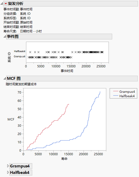 样本数据表 Diesel Ship Engines.jmp 包含关于延长服务期的两艘船(Grampus4 和 Halfbeak4)的发动机维修时间的数据。请参见 Meeker and Escobar (1998)。您想要检查维修进度,了解将来经过多久就需要一次维修。这些观测可以帮助您决定应该何时让发动机停止服务。